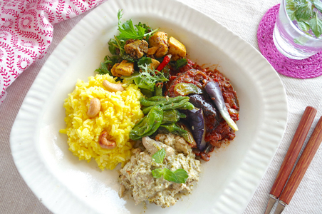おうちで作れるスパイスカレー&スパイシーおつまみ 「揚げなすのトマトカレー」 しっかりコクで大満足のvegeカレー 「チキンのハーブカレー」 ハーブたっぷりのヨーグルトベースの爽やかカレー 「かじきのピクルス、サラダ仕立て」 かじきのスパイシーピクルス。ぜひ、作り置きおつまみの定番に!